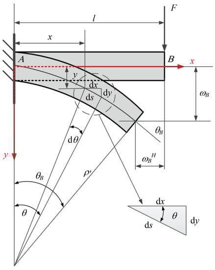 According to Figure 4, l is the total length of the equivalent cantilever beam, is the deflection at any point on the cantilever beam model, is the deflection at the end of the cantilever beam model, and is the radius of curvature. The external force F acts at the end of the cantilever beam at B.