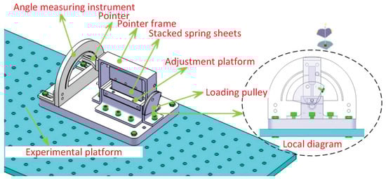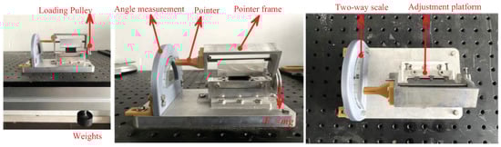 The design of the stacked flexure hinge stiffness test bench is shown in Figure 5, which mainly includes the experimental platform, the adjustment platform (containing the hinge structure), the stacked spring sheet, the loading pulley, the angle-measuring instrument, the pointer, and the pointer holder. Its working principle is as follows: