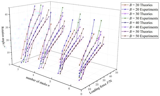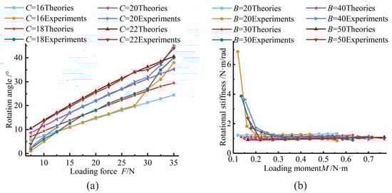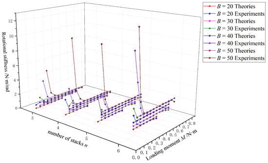 In this paper, the theoretical rotation angle of the stacked flexure hinge is calculated and compared with the experimental rotation angle, and the results are shown in Figure 7; the rotational stiffness of the flexure hinge is calculated based on the loading moment, theoretical rotational stiffness, and experimental rotational stiffness, as shown in Figure 8.