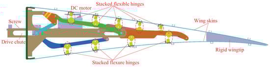 Finally, the novel stacked flexure hinge is applied to a variable-angle wing, and the experimental results of wing deformation demonstrate that the stacked flexure hinge ensures the achievement of the target wing shape, with a maximum error of less than . It is worth mentioning that due to limitations imposed by the stiffness-testing apparatus, the flexure hinge in this study has a longer reserve length, resulting in a smaller effective utilization range. Therefore, for future practical applications, it is advisable to select a smaller reserve length in order to increase the effective utilization range of the flexure hinge.