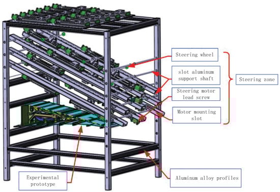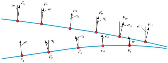 The aerodynamic load acting on the upper skin is equivalent to six loading forces, while the aerodynamic load on the lower skin is equivalent to five loading forces. These 11 equivalent aerodynamic loads are applied to the upper and lower skins of the test prototype using sandbags and steel wires within the loading system. The alignment system’s main function is to keep the equivalent loading forces perpendicular to the skins, as shown in the schematic diagram, Figure 13. It primarily consists of alignment screws and alignment pulleys. To avoid interference between the different equivalent loading forces, the adjustment platform contains three layers of alignment motor screws.