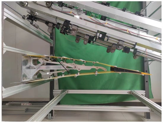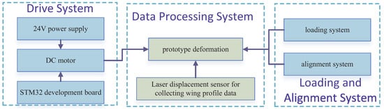 To achieve the experimental effect of simulating equivalent aerodynamic loads, a loading and alignment system has been designed, with its main components shown in Figure 11. A framework diagram of the wing deformation system is shown in Figure 12. The system consists of a loading system and an alignment system, primarily used for loading, alignment, and directional measurement of the test prototype. The driving system, comprising a power supply, motor, driver, and development board, is responsible for driving the deformation of the test prototype. The data-processing system utilizes a grating displacement sensor for point measurement, collects experimental data, and performs curve fitting.