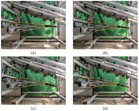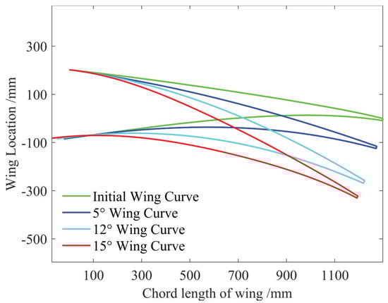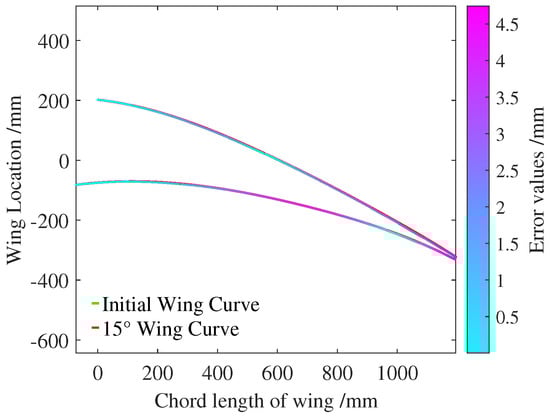 To observe the deformation effect of the experimental prototype, the deformation curve of the experimental prototype is extracted and compared with the deformation curve of the experimental prototype, as shown in Figure 16, where it can be seen that the deformation process of the wing has good conformability. In Figure 17, the 15° deformation curve of the experimental prototype can fit the target deformation curve well, but the loading deformation curve of the experimental prototype still has some errors. The maximum error is about and the maximum error position is located at the tip of the rigid wing tip. Through the loading-deformation experiments on the trailing edge of the variable camber wing, it is found that the stacked flexure hinge can effectively solve the problems of poor conformability and low load capacity of the variable camber flexure wing, which verifies the correctness of the stacked flexure hinge theory and the feasibility of applying it to the variable camber flexure wing.