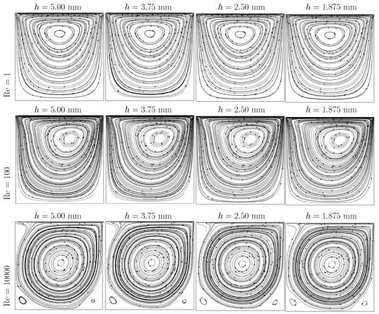 The solution of (49) makes use of the Newton method, with a very intricate Jacobian. The specific source code is available in GitHub [] as files turbulence.nb and turbulence.f90. For the driven cavity, see Figure 2; streamlines for the turbulent case are shown in Figure 3.