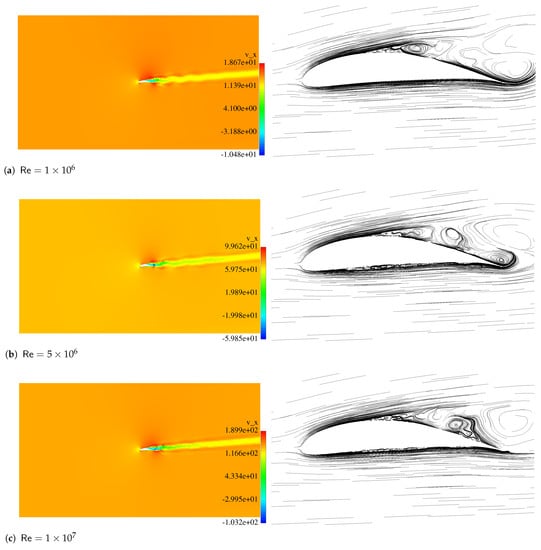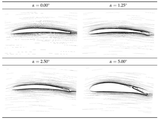 We adopted a control volume consisting of a rectangle, including the airfoil geometry, as shown in Figure 4. The chord line has a 1 m length. For and the optimized airfoil, we present the results in Figure 5 for the optimized airfoil. The velocity contour plots for the conditions are presented in Figure 4 along with the velocity lines in the neighborhood of the airfoils. A video of the optimized case flow for is available on the video repository [].