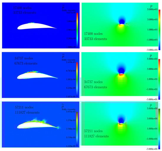 The convergence of results for the eddy viscosity and pressure p using three distinct meshes (17,400, 34,737, and 57,211 nodes) shows that smoothness increases with mesh refinement. Figure 6 shows the convergence of these fields.