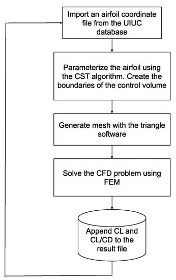 The data collection was performed with the flowchart in Figure 7. A total of 1598 airfoils from the UIUC database were considered valid for this application. Specific features of the machine learning procedure are as follows (see also []):