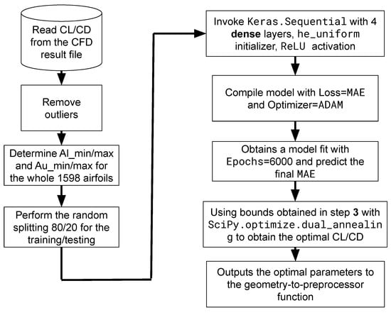 The optimized airfoil optimization procedure consists of two stages: in the first stage, the relation between the CST parameters and the lift/drag ratio is established by machine learning. In the second stage, this function is maximized. In the first stage, we resort to the machine learning algorithm to actually construct a regression relating with 10 parameters defining the upper and lower faces of the airfoil. The optimization processes in the second stage are based on the dual annealing algorithm. We make use of the libraries TensorFlow [,], SciPy, and NumPy. Optimization is performed with the function SciPy.optimize.dual_annealing. It uses a generalization of simulated annealing with a final gradient-based local search stage. gradients are available from the machine learning model. In practice, the machine learning system makes use of a large set of input and output data, relates it statistically, and establishes the rules for regression. More data and better data will produce a better regression []. We note that, although possible (see, e.g., [,], the intent here is not to use full-feature machine learning to replicate the finite element simulations, but rather to extract the ratio.