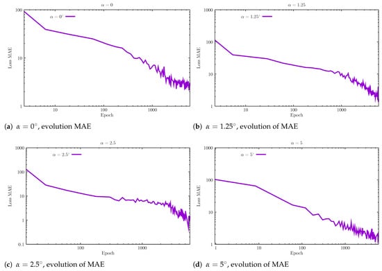 Using Keras/TensorFlow [,] combined with global optimization, it is possible to train and then optimize the value of using (i) XFOIL [] results or (ii) FEM RANS []. In terms of optimization, the toolkit from SciPy was adopted with the function optimize.dual_annealing. We show the evolution of loss and MAE (mean absolute error) in TensorFlow [], as functions of the epochs, from which we have 6000, in Figure 11 for the four considered angles of attack: and . The precision is sufficient for obtaining airfoil profiles in parametric form, which are superior to those in the UIUC database [].