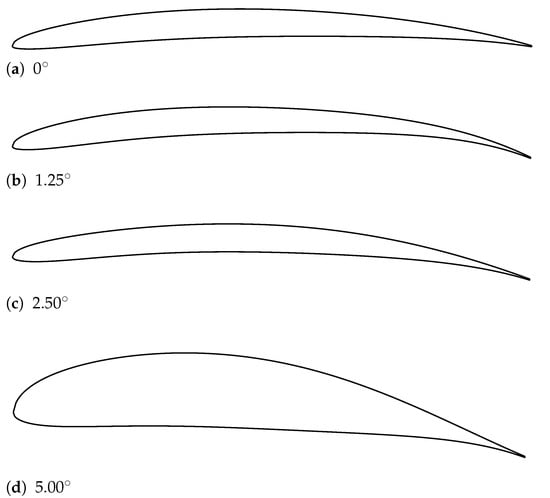 - Selig, M. UIUC Airfoil Data Site; Department of Aeronautica, Astronautical Engineering University of Illinois at Urbana-Champaign: Urbana, IL, USA, 1996. [Google Scholar]