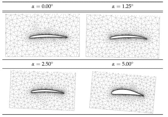 For the four optimal airfoils, we use SIMPLAS [] with uniformly imposed velocity and initial conditions; . Meshes are refined locally, as shown in Figure 13.