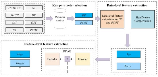 This study addresses the challenge of assessing the health status of the engine bleed air system. It utilizes QAR data as experimental support, and proposes a multi-level feature extraction method to construct health indicators for the system. First, the original QAR data undergoes data-level feature extraction to compress the uneven-length and unannotated data into consistent-length feature vectors that can represent performance anomalies. Second, the RDAE, employing unsupervised learning, performs feature-level feature extraction on the feature vectors to obtain a subset of features in the hidden space, which is used to construct health indicators for the and . Finally, in the HI construction experiment, the separation performance of the HI curves between normal and abnormal samples is compared, and it is found that RDAE demonstrates better performance in constructing health indicators.