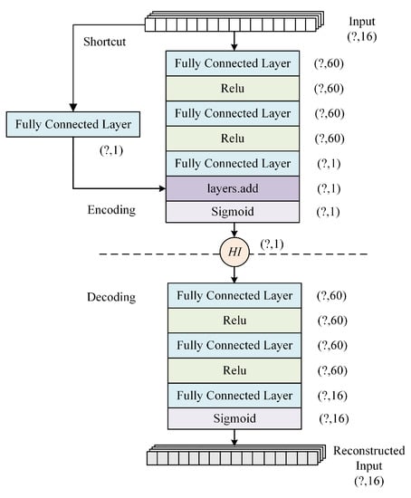 RDAE is a variant of the AE architecture that incorporates residual connections inspired by Residual Neural Networks (ResNets). The term “Shortcut” in Figure 3 refers to a direct connection that adds the input to the output of a layer, also known as the “residual” connection. This connection addresses the issue of vanishing gradients and enhance the network’s learning capability and performance. In our approach, we adopt an add-type ResNet structure, where the input layer is connected to subsequent layers through shortcut connections, allowing the feature information to be combined. We employ a fully connected layer to create the shortcut connection, enabling the input data to undergo an identity mapping for HI calculation. This approach helps prevent performance degradation that may occur when stacking deeper layers in the network.