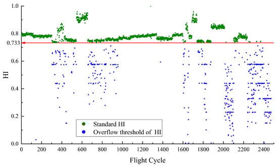 Figure 5 depicts the HI for constructed using RDAE. In the calculation of HI, if the temperature is higher, the resulting HI value is smaller. Therefore, the upper limit value of temperature corresponds to the lower limit value of HI. The red line in the Figure 5 represents the performance baseline, with a HI lower limit of 0.733. The normal sample points for this case are determined by selecting the samples that satisfy . Their corresponding HI values are defined as the standard HI, which are the points above the baseline 0.733. As the performance anomaly detection is focused on high temperatures, no upper limit is specified for the HI of . The red points represent non-standard HI samples that do not meet the normal feature conditions but fall within the baseline threshold. There are no red points which means all abnormal points are separated.
