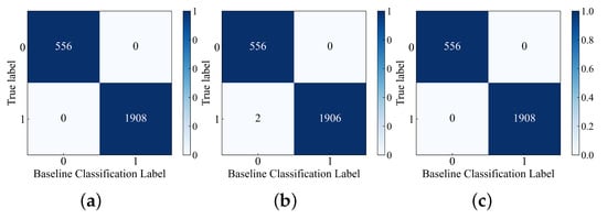To visually assess the performance of the HI construction models in separating normal and abnormal samples, the results obtained from Figure 4, Figure 5, Figure 6, Figure 7, Figure 8 and Figure 9 were visualized using confusion matrix plots, as shown in Figure 10 and Figure 11. In Figure 10 and Figure 11, the label “0” represents normal samples, and the label “1” represents abnormal samples. The confusion matrix represents the cases of classification errors. For example, in Figure 10a, the true label “0” is classified into baseline classification label “0” and “1” with counts of 1130 and 0 respectively. Similarly, the true label “1” is classified into baseline classification label “0” and “1” with counts of 72 and 1272 respectively. The meanings of the remaining figures are also similar.