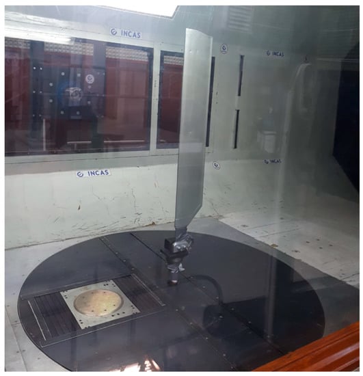 The currently used aluminium tail rotor blade of an IAR330 helicopter has a length of 1244.3 mm, being characterized by an NACA0012 symmetric airfoil and no blade twist along the length of the blade. The chord measures 186.5 mm, and the total mass is approximately 2.68 kg. A model of the aluminium blade during aerodynamic analysis inside a subsonic wind tunnel is presented in Figure 2 [33].