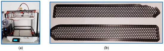 The honeycomb core of the tail rotor blade: (a) 3D printer used for manufacturing the honeycomb, (b) the two symmetric honeycomb components.