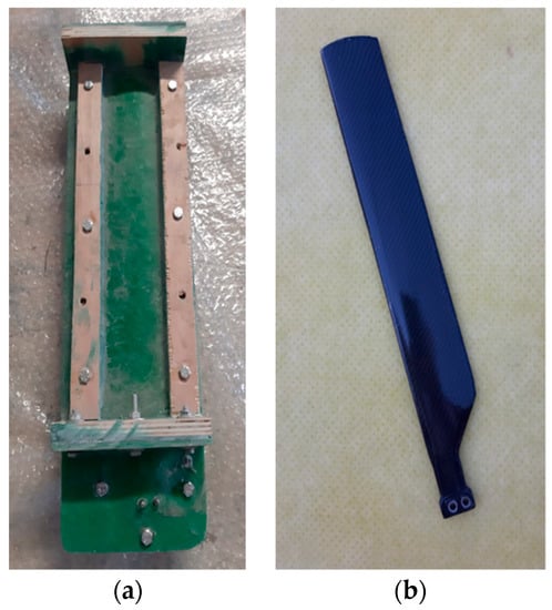 The T300 carbon roving consists of unitary unidirectional fibres positioned lengthwise, adjusted to fit the dimensions of the tail rotor blade spar. The fibres were positioned around two metal bushings, which represent the mounting points of the tail rotor blade to the antitorque rotor. These fibres have the best tensile properties of all the materials of the composite blade. The spar was obtained by applying the same epoxy resin on the fibres, thus uniting them in a single solid body. The wooden frame, which was conceived to lock the two moulds in place with screws placed on all sides, is depicted in Figure 6, as well as the composite tail rotor blade after applying the surface finish.