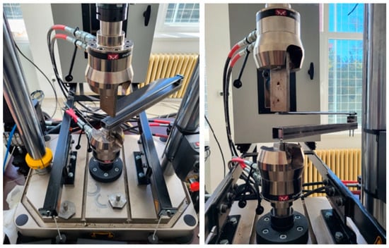 The testing procedure is similar to the one used by composite blade manufacturers to assess fatigue strength [41,42,43]. An Instron 8872 testing machine with a 25 kN load cell was used to apply a specific load on the free edge of the blade. The metal support beam was chosen rigid enough in order to prevent the entire assembly from bending at the moment the force was applied. The blade was fastened to the beam with two bolts at the foot of the blade, as shown in Figure 7.