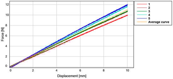 A total of five individual tests were realized with a constant displacement of 2 mm/min and a maximum displacement of 10 mm, adjusted using the dedicated software, WaveMatrix, of the testing machine. The reaction force was measured by using the testing system and returned in tabular form. Ambient conditions consisted of low UV exposure, under 60% air humidity, and an ambient temperature of 23 °C. The force–displacement curves obtained for the experimental tests are presented in Figure 9 and Table 3.