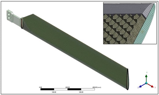 The three-dimensional finite element model of the blade was conceived in Ansys Workbench [44], at the same scale of 1:3 with respect to the real dimensions. The 3D mesh consisted of 20-node solid elements (Solid 186) for the honeycomb core and 10-node tetrahedral elements (Solid 187) for the blade spar and skin, with a selected element size of 2 mm. The entire model comprises 5,057,655 nodes and 2,240,226 elements, which resulted in a significant processing time of almost two days. More than half of these elements were placed on the honeycomb due to its irregular shape.