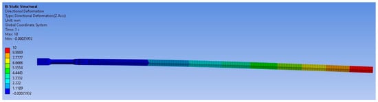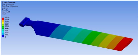 The boundary conditions employed in the FEA consisted of the fixed support command, applied vertically, on the inner surfaces of the tail rotor spar, while a displacement of 10 mm was imposed on the free edge of the tail rotor blade, as illustrated in Figure 11.