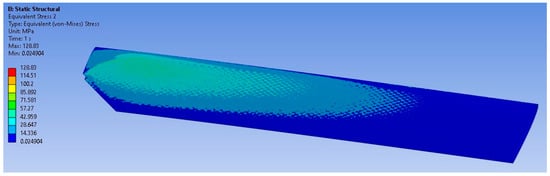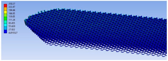 In Figure 14, it can be seen that the maximum value of the equivalent von Mises stress is 128.83 MPa. This value occurs in the carbon-fibre-laminated skin of the blade, located towards the middle section of the blade. The honeycomb core exhibits a maximum stress of 250.27 MPa (Figure 15) but in a very small area located both on the upper side and on the lower side. Because this is an extremely localized effect, it does not produce the failure of the core. In what concerns the spar element, the maximum stress of 261.41 MPa is localized on the foot of the blade; this is the reason why this element is manufactured to ensure a high degree of stiffness (Figure 16).