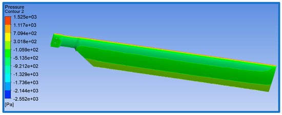 The solution was obtained after approximately 500 iterations. Figure 18 displays the pressure contour on one face of the tail rotor blade at an incidence α = 0°. The maximum pressure region corresponds to the leading edge of the blade, with a value of 1525 Pa.