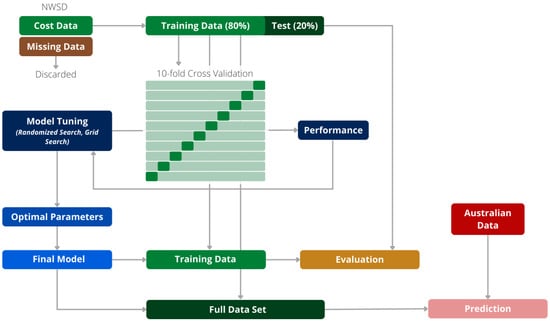 This research set out to estimate the cost of wildlife strikes in Australia by tuning and training a supervised machine-learning algorithm and applying it to new data. This and the following sections provide some background to the random forest modeling technique, model tuning, and refinement, as well as a description of the process used to predict wildlife strike costs using the Australian wildlife strike database. As mentioned above, this project leverages the work of Altringer et al. [9], who identified their random forest models as performing the best. They outlined a model training and testing workflow based on Raschka [25], which was tailored to this project’s objective.