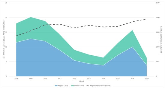 While collisions between aircraft and wildlife, often referred to as wildlife strikes, are recognized as significant economic and safety issues for the aviation industry [1,2], the complex nature of costs associated with the management of wildlife strikes poses inherent challenges. These challenges are exacerbated when missing data hamper cost–benefit analyses that support effective wildlife hazard management practices. Allan [3] notes that wildlife-strike-prevention costs, which the airport operator typically bears, are often expensive; however, they are incurred to save on costs suffered by the aircraft operator, who often considers these data commercially sensitive and manages them with particular sensitivity [3,4]. International guidance material recommends the collection of cost impacts in wildlife strike reporting [5], and some jurisdictions collect these data on a per-strike basis. However, in Australia, where wildlife strike reporting is mandatory [6], these data are not collected, creating a gap in the aviation industry’s ability to quantify the wildlife strike problem and assess the effectiveness of risk management strategies.