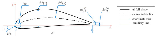 According to the thin-airfoil theory, the mean camber line of an airfoil is related to its aerodynamic performance parameters, including the lift coefficient and the pitching moment. The idea of the PAERO method [26] is to use these aerodynamic performance parameters as design variables. The mean camber line, , can be expressed as follows: