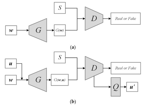 Because the noise variables, , of the standard GAN are uninterpretable, the InfoGAN [30] model was proposed to add a number of latent variables that are interpretable. The architecture of the InfoGAN model is shown in Figure 3b. Like GAN, this model also has a G and a D that play games with each other and ultimately enable the G to synthesize data similar to the training data. Unlike GAN, the input variables of G include the latent variables, . InfoGAN adds the auxiliary distribution, Q, to restore the inputted to the G. Both Q and D can share the convolution layers. InfoGAN maximizes the mutual information, , of the latent variables,, and the generated samples, . By training, the main features of the data can be extracted into .