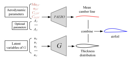 The schematic diagram of the proposed airfoil parameterization is shown in Figure 4. The PAERO method is used to represent the mean camber line, and the generative model is used to represent the airfoil thickness distribution. The parameters used for the camber representation include two types, namely the aerodynamic performance parameters and the optional parameters. The parameters used for the thickness representation are the latent variables of the generator, G.