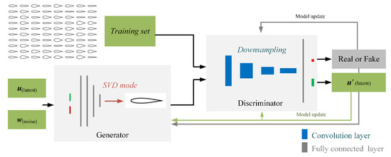 The training set contains a total of 1433 symmetrical airfoils, each of which is represented as a vector in the format of 241 × 1. The latent variables, , and the noise variables, , are used as the input of the generator, G, where follows a uniform distribution in [0, 1], and follows a normal distribution with a mean of 0 and a variance of 1. G includes the multi-layer full connected layers and a mode layer. The modes come from the SVD decomposition of symmetric airfoils. The research by Li et al. [14] showed that the first 20 modes were already sufficient for fitting the airfoils. In addition, using the modes as the last layer of G is helpful for ensuring a smooth surface and a symmetrical geometry. The discriminator, D, is composed of a number of convolution layers and a full connected layer. The convolution layers extract the features of the airfoil, and the full connected layer integrates them for judgment. An independent full connected layer, Q, is set behind the convolution layers of D to extract the features of the generated airfoil and tries to restore the input information, .