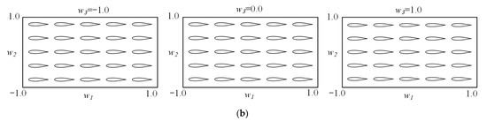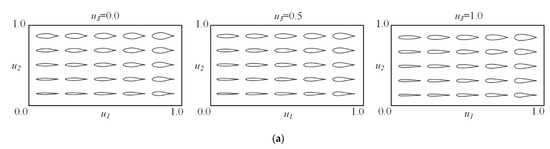 Figure 8a shows the results of airfoil synthesis by changing each latent variable, while the noise variables, , remain 0. It can be seen that each component of is related to one of the geometric features. is related to the leading edge radius, is related to the airfoil thickness, and is related to the location of the maximum thickness. Figure 8b shows the results of airfoil synthesis by changing the first three components of , while the latent variables, , remain 0.5. It can be seen that there is no significant difference between the generated airfoils, indicating that the features of symmetric airfoils have been mainly extracted into the latent variables, .
