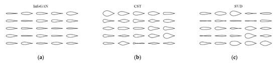 Symmetric airfoils generated by different parameterization methods: (a) InfoGAN; (b) CST method; (c) SVD method.