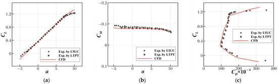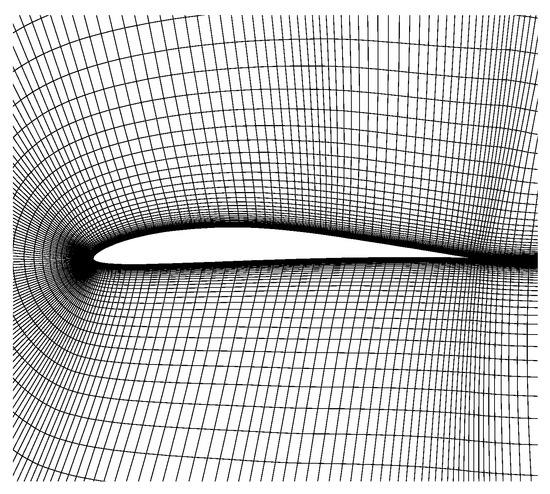 This section will test the accuracy of aerodynamic performance parameters. CFL3D [35], an open-source CFD solver based on multi-block structured grids, was used for high-fidelity aerodynamic performance calculations. The CFD solver was first validated by the wind tunnel test of the airfoil E387 [36]. The flow conditions are Ma = 0.1, α = 0° and Re = 0.2 × 106. Note that the wind tunnel test data were measured by allowing a free transition. The Spalart–Allmaras one-equation turbulence model coupled with an eN empirical method for the transition prediction was adopted. Three types of grids were used to calculate the aerodynamic performances. The farfield is 15 times the chord length, and the height of the first layer is set to 1 × 10−5 to ensure y+ < 1.0. As shown in Table 3, the results of grid No. 2 are close to those of the densest grid, No. 3. Considering the computational cost, grid No. 2, shown in Figure 11, was adopted in the simulations. The comparison of the numerical simulation and the wind tunnel test is shown in Figure 12, indicating a satisfying accuracy.