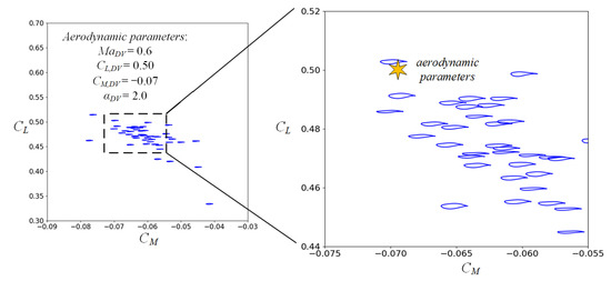The airfoil performance parameters at a low Mach number were first tested. The aerodynamic performance parameters were set as follows: , , and . The optional parameters are not considered here. The generator, G, synthesized the thickness distributions based on the latent variables, , of a random distribution. The dimension of is three, and the value range is [0, 1]. High-fidelity CFD simulations were used to verify the accuracy of the aerodynamic performance parameters. The simulation conditions were , and . The simulations were performed assuming a fully turbulent flow. A total of 50 airfoils were randomly generated, and the test results are shown in Figure 13. The given aerodynamic performance parameters are represented by a star, and the airfoils are displayed on their corresponding aerodynamic performance coordinates. It can be seen that due to the viscous effect, and . However, the aerodynamic performances of most airfoils are close to the given parameters.