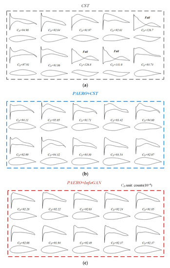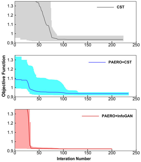 The optimization tests were repeated 10 times for each method by using random initial design variables. The convergence histories are shown in Figure 15. The shaded regions in the figure show the convergence histories of different tests, and the solid lines are the average convergence histories. It can be seen from the convergence histories that the method of using the InfoGAN model for thickness representation has the best performance. It converged near the minimum point after about 30 iterations, far fewer than the other two methods. Note that the large initial objective function shown in the figure is due to the fact that the area of the initial shape does not satisfy the design requirements and a large penalty function is imposed. The final designs of airfoils are shown in Figure 16. The optimized results of the InfoGAN model maintain the features of the existing airfoils and are all physically reasonable. On the contrary, the optimized results of the CST method are divergent, indicating a less compact and bumpier design space. Thus, it can be concluded that the proposed method is significantly more efficient and more robust than the traditional CST method.
