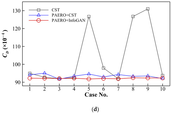 Comparison of the optimized results of using different parameterization methods: (a) CST; (b) PAERO + CST; (c) PAERO + InfoGAN; (d) drag coefficients.