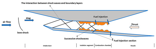 To further improve the specific impulse performance of the hydrogen-fueled scramjet engine, the combustion mode and operating route of a hydrogen-fueled scramjet engine are analyzed [19]. The one-dimensional method was used for the numerical simulation of a two-stage hydrogen jet scramjet engine at a Mach number ranging from 4–7. Choubey et al. [20] presented the current status of the development of hydrogen-fueled scramjet engines and the challenges faced when using hydrogen fuels. In addition, the advantages of using hydrogen as a fuel compared to other hydrocarbon fuels were thoroughly discussed. Choubey [21] analyzed some mixture enhancement methods based on cavity-based injection, as proposed in recent research works. The impact of the cavity on the performance of the scramjet engine combustion chamber was reviewed from three aspects: changes in the shape/geometric structure of the cavity flame holder, the location of the fuel/air injection scheme, and the latest progress in the development of the resonant cavity.