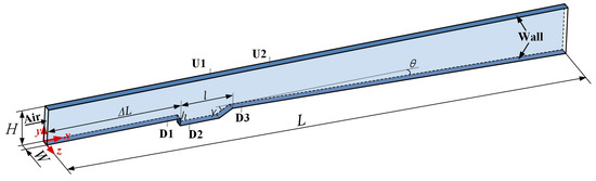 The configuration of the scramjet combustion chamber [26] used for the calculations in this study is shown in Figure 2. The length of the combustion chamber (L) is 700 mm and the inlet height (H) is 50 mm. The combustion chamber adopts a design that expands the lower wall surface of the cavity, and the inclination angle (θ) of the cavity is 2°. The arrangement of the combustion chamber nozzle refers to the classical test model with a total width of the combustion chamber of 70 mm. To simplify, a single nozzle is selected and the calculated width of the combustion chamber in the spanwise direction is set as 10 mm. Two side walls are set as symmetrical to reduce the effects of the simplified model. On the upper wall of the combustion chamber, hydrogen injection holes U1 and U2 are arranged, and injection holes D1, D2, and D3 are arranged on the lower wall. The diameter of the injection holes is 1 mm, and ejection occurs perpendicular to the wall. The centers of upper wall injection holes U1 and U2 are respectively 220 mm and 300 mm from the combustion chamber inlet. Injection hole D1 is arranged on the upstream wall of the cavity and Injection hole D2 is arranged inside the cavity. Injection holes D1 and D2 are arranged on the two sides of the front wall of the cavity at a distance of 15 mm from each other. Nozzle D3 is arranged on the downstream wall of the cavity, and its center is 15 mm from the rear edge of the cavity. The distance from the cavity to the combustion chamber entrance (ΔL) is 180 mm. The total length of the cavity (l) is 70 mm with a height (h) of 10 mm, an aspect ratio (l/d) of 7, and an angle of the rear wall (γ) of 30°.