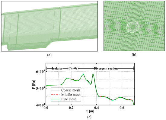 This section mainly introduces the grid generation of the model. As the combustion chamber is relatively long, a coarser grid is employed for conducting numerical calculations of flow field changes throughout the afterburning combustion chamber. Figure 3a provides an overview of the grids of the combustion chamber. As the injection holes in the combustion chamber are distributed on both the upper and lower surfaces, grid refinement was applied in the upper and lower sections of the combustion chamber and inside the cavity. In addition, grid refinement was performed on the upper and lower surfaces of the combustion chamber to enhance the accuracy of the boundary layer calculations. Figure 3b presents the grid details near the injection holes, where the O-block method was used for grid refinement, with a grid size of 0.02 mm. The total grid number of the computational domain is 4 million, with a minimum grid size of 0.1 mm and a maximum grid size of 0.25 mm.