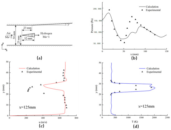 Under the condition of unburned flow, the hydrogen flow rate is fast and there is no high-temperature heat source to support it, so it is difficult for the hydrogen emitted from the tail of the straight plate to effect large-area mixed combustion; as such, ignition is needed. Figure 4c,d respectively show comparisons of the calculated time-averaged velocity and the time-averaged temperature distributions along the spanwise direction (y) with the experimental results after hydrogen ignition at x = 125 mm. The calculated values of the time-averaged velocity and the time-averaged temperature distributions at different locations agree with the experimental results. In general, the results obtained by this numerical method are consistent with the distribution trend of the experimental results, which indicates that the adopted numerical method is reasonable.