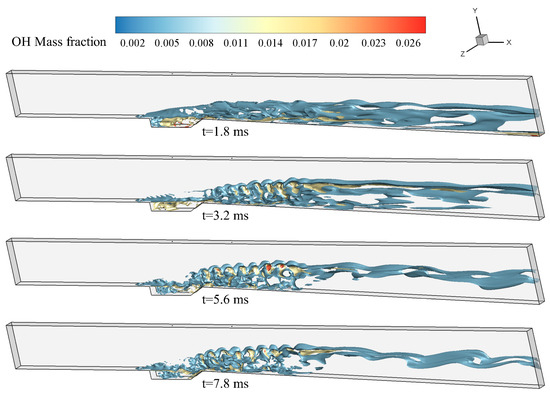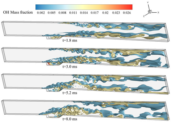 The development of the mass fraction of OH free radicals in the combustion chamber of Case 4 is shown in Figure 8. Since the D1 and D3 injection holes are both arranged on the lower wall, the combustion zone is completely located in the cavity and downstream of the cavity. At t = 1.8 ms, the combustion intensity is relatively low due to the initial fuel injection. With the heat release due to fuel combustion, the average pressure in the combustion chamber gradually increases, and the combustion shock wave string moves a short distance upstream. However, since the downstream nozzle is under rich combustion conditions and the combustion intensity is weaker, the overall increase in the combustion intensity of the fuel is limited. The pressure increase is relatively small, and the slight forward movement of the shock wave string almost does not change the flame stabilization mode of the combustion chamber of Case 4, i.e., the flame always remains inside the cavity or downstream of the cavity. Compared with Case 1 and Case 5, due to the weaker combustion shock wave string, the degree of boundary layer separation caused in the combustion chamber is smaller in Case 4.