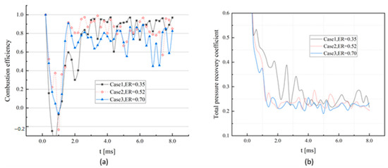 Comparisons of the combustion efficiency at the outlet of the combustion chamber varying with time for Cases 1, 2, and 3 are shown in Figure 7a. The calculation formula for combustion efficiency can be seen in Equation (3). As shown in the figure, the time required for the flow field of the Case 1 combustion chamber to stabilize is approximately 3.0 ms, while the time required for the flow field of the Case 2 and Case 3 combustion chambers to stabilize is only about 2.0 ms. This may suggest that there is a direct correlation between the jet equivalence ratio and the flow field stabilization rate within a certain range. Additionally, the figure shows that the higher the global equivalence ratio of the fuel in the combustion chamber, the lower the combustion efficiency, which is actually related to the fuel mixing. In this section, the equivalence ratio is increased by arranging more injection holes. Therefore, when there are injection holes arranged upstream of the combustion chamber, continuing to arrange injection holes downstream leads to insufficient air content in the fuel mixing of the downstream injection holes, resulting in a large amount of fuel waste. To address this phenomenon, different steady flame methods of the combustion chamber have been proposed, such as adding a baffle injection in the middle of the combustion chamber. Although this also increases the global equivalence ratio of the fuel, it effectively uses the air channel in the middle of the combustion chamber, which has benefits in terms of improving the combustion efficiency. Figure 7b compares the changes of in the total pressure recovery coefficient at the outlet of the combustion chamber, varied with time, for Cases 1–3. The calculation formula is Equation (2). It was found that as the equivalence ratio increases, the total pressure recovery coefficient at the outlet generally shows an upward trend. This indicates that when the fuel equivalence ratio is higher, the intensity of the combustion shock wave string in the combustion chamber also increases, which leads to an increase in total pressure loss.