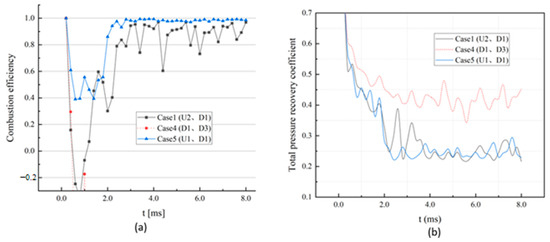 (a) Comparisons of the averaged combustion efficiency at the outlet of the combustion chamber varying over time for Cases 1, 4, and 5; (b) Comparisons of the total pressure recovery coefficients the outlet of the combustion chamber varying over time for Cases 1, 4, and 5.
