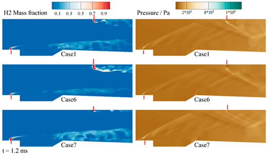 The effects of the injection pressure on the H2 mass fraction and pressure distributions are displayed in Figure 11. Details of the injection pressure for Cases 1, 6, and 7 are presented. As the injection pressure increases, the depth of the hydrogen injection and the mass fraction also increase, as shown for injection hole U2 in Case 6. At the same time, a comparison of the pressure distributions reveals that as the injection pressure of the jet hole increases, the bow shock wave formed by the influence of the incoming air flow in front of the injection hole becomes stronger, and the initiation point of the shock wave is deeper. This is due to the different injection depths caused by the varied pressures, resulting in different locations of the velocity shear layer, and hence, a deeper original point for the shock wave formation. Moreover, it can be seen that the averaged pressure in the combustion chamber of Case 7 is slightly higher than those of the other two cases, at t = 1.2 ms. It is shown that the injection pressure on the lower wall of Case 7 is the highest, and the local equivalence ratio near the cavity is higher than in the other cases. Since the cavity plays a significant role in the mixing and ignition of the fuel, the fuel burns quickly on one side of the cavity when the equivalence ratio in the cavity region is high. The construction speed of the combustion wave system is fast, and the overall average pressure in the combustion chamber is higher at the same initial combustion time. During the initial stage of supersonic injection, the rate of pressure increase is related to the local equivalence ratio in the cavity; the higher the local equivalence ratio in the cavity, i.e., the higher the injection pressure of the injection hole on the same side upstream of the cavity, the faster the pressure in the combustion chamber increases.