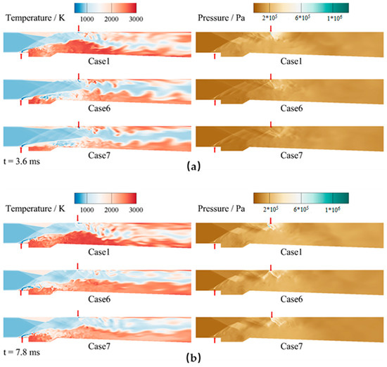 The temperature and pressure distributions for Cases 1, 6, and 7 at different times (t = 3.6 and 7.8 ms) are shown in Figure 12. It can be observed that the combustion in Case 1 is more intense and the pressure increase is higher at t = 3.6 ms. The temperature and pressure distributions at different time can also indirectly show the intensity of fuel combustion and the amount of heat released. For Case 7, which has a higher injection pressure at the D1 injection hole and a larger local equivalence ratio, the average temperature at the cavity location is lower than those in Case 1 and Case 6. This indicates that fuels with a higher equivalence ratio lead to a rich combustion state within the cavity during the mid-combustion phase. The mass exchange rate between the cavity and the incoming air is low, and there is not enough air to sustain the combustion of a large amount of fuel inside the cavity. It is noted that the flow field situation in Case 1 is quite different from those in the other two cases. It has a larger high-temperature region and the average pressure in the combustion chamber is higher than the other two cases. There is also a range in the high-pressure region near the U2 injection hole. This suggests that during the mid-phase of supersonic injection, the same pressure in the jet hole can effectively increase the combustion rate of the fuel. The combustion flow fields of the three cases are basically stable at t = 7.8 ms. It was found that the pressure in the combustion chambers of Case 6 and Case 7 are basically the same after stabilization, and the distribution pattern of the temperature field is also consistent. Compared with the other two cases, Case 1 has a higher average pressure in the combustion chamber, a larger high temperature region near the upper and lower walls, and a higher combustion temperature compared to the other two cases. This suggests that multi-position injection in the scramjet combustion chamber can effectively improve the combustion rate and intensity of the fuel in the scramjet combustion chamber if the global equivalence ratio of fuel injection is consistent and the injection pressure of each injection hole is maintained at close to or the same values.