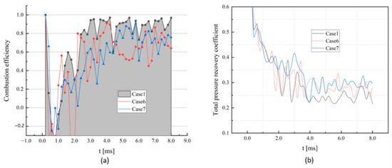 (a) Comparison of the combustion efficiency at the outlets of the combustion chambers over time for Cases 1, 6, and 7; (b) Comparison of the total pressure recovery coefficients at the outlets of the combustion chambers over time for Case 1, 6, and 7.